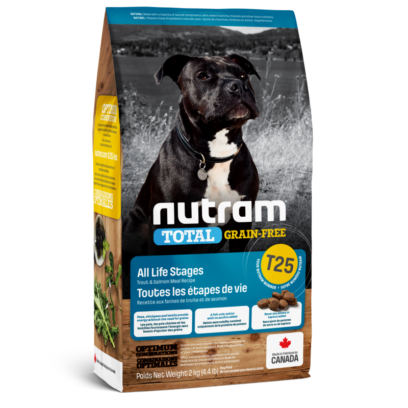 La nourriture naturelle pour chiens Nutram Total sans grains T25 (Nutram Total Grain-Free®) au saumon et à la truite est une préparation holistique, riche en nutriments et aux nombreux bienfaits, qui améliore le mieux-être de votre animal de compagnie par la nutrition. Notre approche holistique repose sur l’utilisation d’ingrédients sains dont le nom est facile à prononcer, tel qu’un mélange à faible indice glycémique de pois verts, de lentilles et de pois chiches comme source de bons glucides et de protéines de qualité. Nous y avons ajouté du chou vert frisé, riche en phytonutriments, et de la menthe poivrée, une herbe fine apaisante qui favorise une détoxification naturelle et en douceur de l’organisme. Mieux encore, les combinaisons optimales de Nutram, « Optimum CombinationsMC », renferment un mélange de bleuets et de mûres, riches en antioxydants puissants, qui aident à renforcer le système immunitaire et à promouvoir la vitalité. Vous pouvez avoir la certitude que la nourriture de votre animal de compagnie est saine et bénéfique, et qu’elle contribue à son mieux-être général.